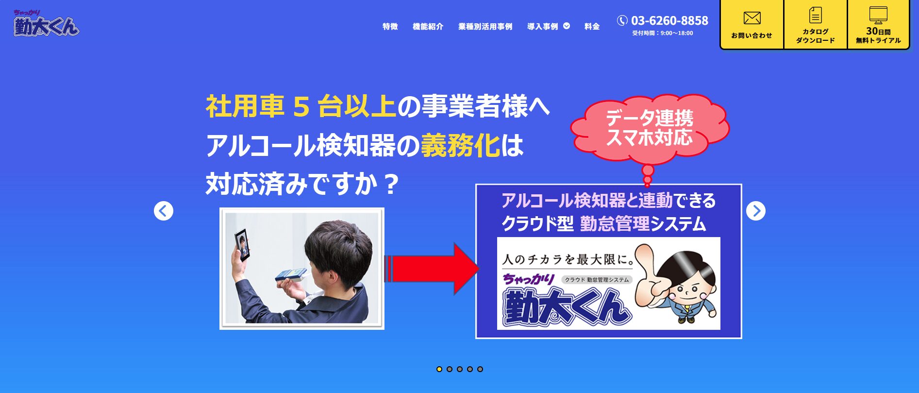 メッセージを個別に設定し、打刻時に表示することも可能です。また、アルコール測定器と連動し、出退勤時のアルコール測定を徹底できます。特別休暇や特殊な勤務形態、複雑な申請・承認フローにも対応可能です。初期費用、月額費用ともに問い合わせが必要です。